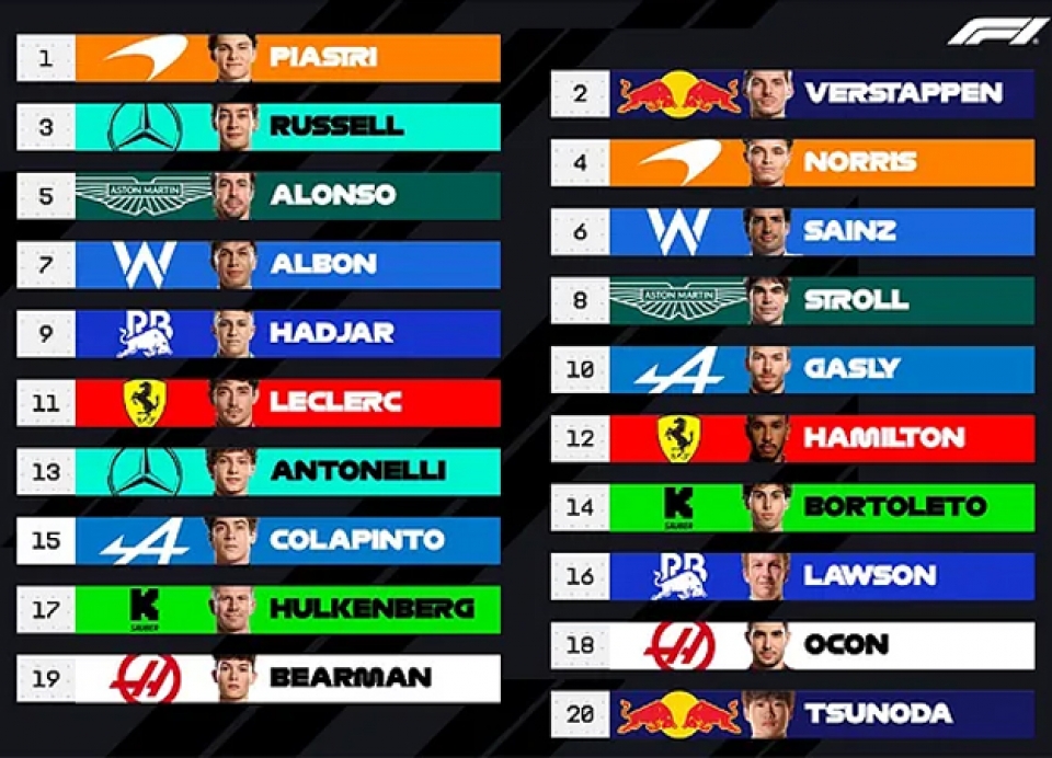 En unas pruebas de clasificación marcadas por dos aparatosos accidentes, uno del piloto japonés Yuki Tsunoda y otro del argentino Franco Colapinto, el Gran Premio de Emilia Romagna tendrá en la pole position al actual líder del campeonato Oscar Piastri. El circuito de Imola verá una intensa y pelada carrera desde la hora 10 de nuestro país, que tendrá en la primera línea de la parrilla al "pelador" Max Verstappen, quien a fuerza de "muñeca" lleva a su Red Bull al límite para tratar de compensar el rendimiento por debajo de los McLaren esta temporada. En la segunda fila estarán el sorprendente George Russell con el Mercedes y el otro McLaren de Lando Norris. En contrasentido fueron muy bajos las performances de los Ferrari, quedando Leclerc en el puesto 11 y Hamilton en el 12. |