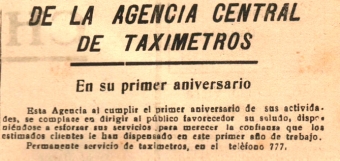 TAXIMETROS- Estos trabajadores del volante también se favorecían con ese arribo de posibles pasajeros y destacamos que en esos días se promocionaba la Agencia conocida como “Triple 7” ubicada en bajos del Hotel Brisas del Hum, cuyo número telefónico era el 777 ofreciendo el servicio de 11 taxímetros, número que poco después se amplió a 14 coches. Esta agencia se había establecido el 21 de julio del año anterior (1946) brindando un reconocido servicio a la población.