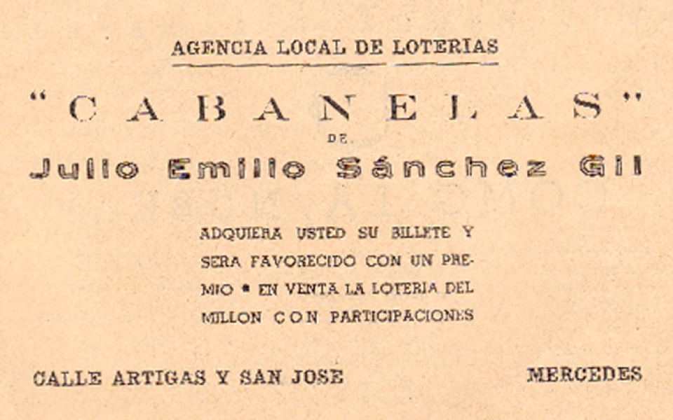 La Agencia Cabanelas que había cambiado de local ofrecía su servicio de loterías y quinielas en calle Artigas y San José, lugar ocupado antes por la Agencia de la Empresa Onda. Era su titular Julio Emilio Sánchez Gil.