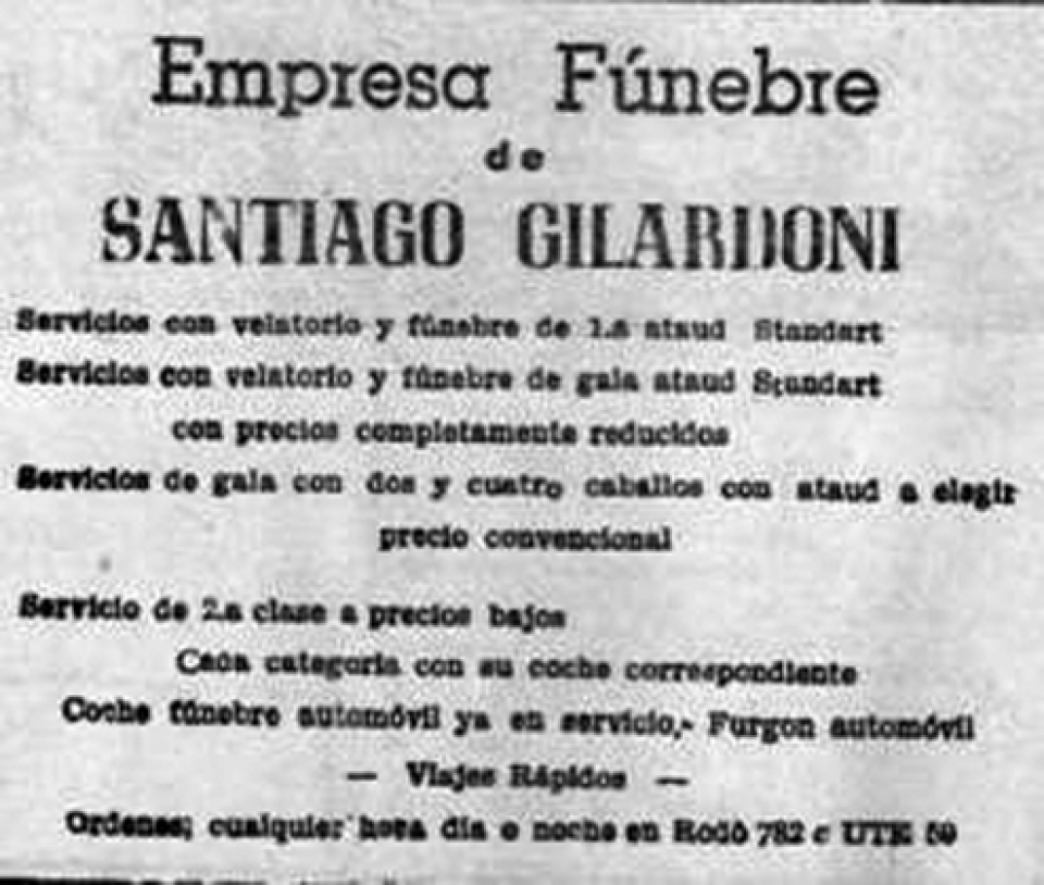 EMPRESA FUNEBRE. Destaca su servicio que se realiza con 3 carrozas, siendo su propietario don Santiago Gilardoni y estaba instalada en calle Rodó 782, hoy lugar donde funciona el Casino.