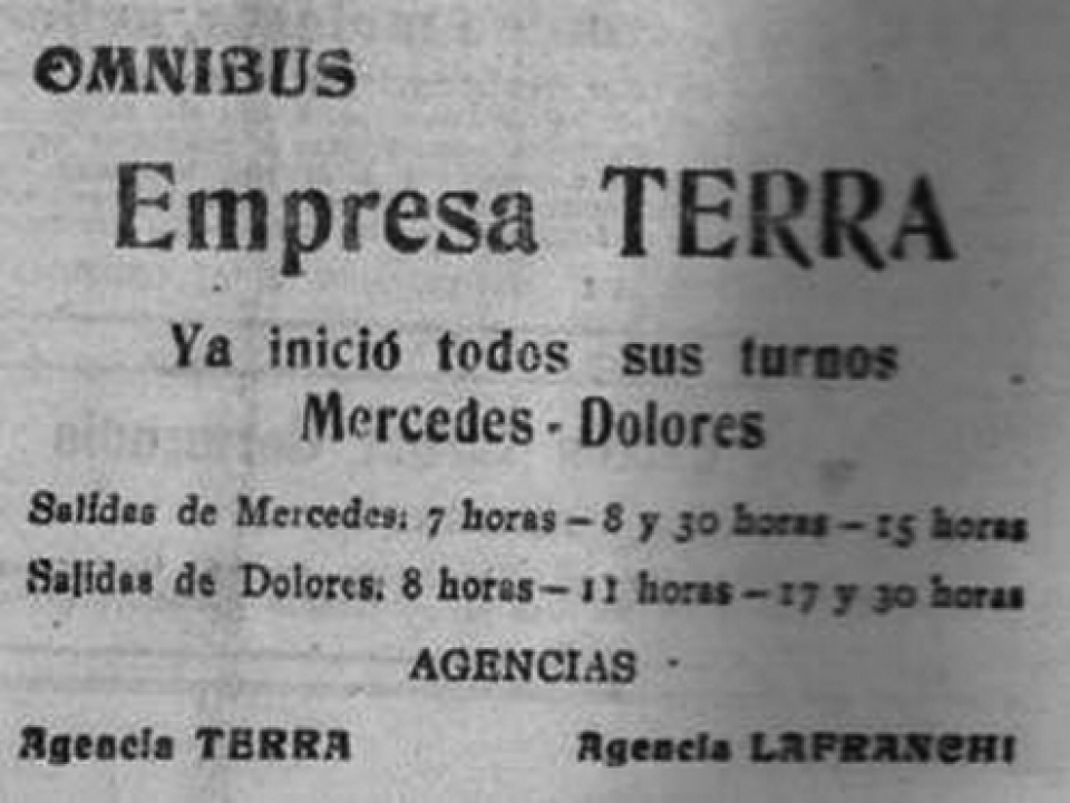 EMPRESA TERRA. Ofrece el recorrido de sus ómnibus en el trayecto entre nuestra ciudad y la ciudad de Dolores, los que realizarán tres turnos diarios en ese trayecto. La Agencia Terra ubicada en la esquina de calles Colón y Roosevelt de entonces, será el lugar desde donde se embarquen los viajeros en Mercedes, mientras que en Dolores será la Agencia Lafranchi el punto de salida y llegada de los pasajeros.