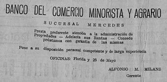 A través de este aviso se establece la conversión de aquel escritorio de Miláns en la sede del Banco del Comercio Minorista y Agrario.