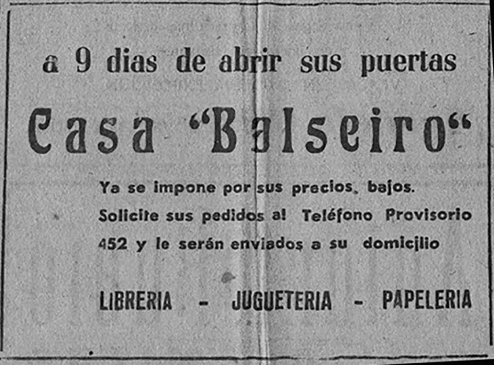 - La “Librería Balseiro”, papelería-juguetería era recién inaugurada y pronto se constituye en punto de referencia en su ramo, mientras que en cambio se ofrece en venta “La Barraca Nueva” de J. Pazos Luque reconocido comercio que tenía su local en calle E. Giménez frente al Cine Rex. Mientras se produce un cambio de firma en otra de la tradicionales tiendas de la ciudad, pasando la Casa “Trivelloni y Moreno” a seguir girando como “J. Moreno Bernabeu” ubicada en la calle Artigas Nº. 267.