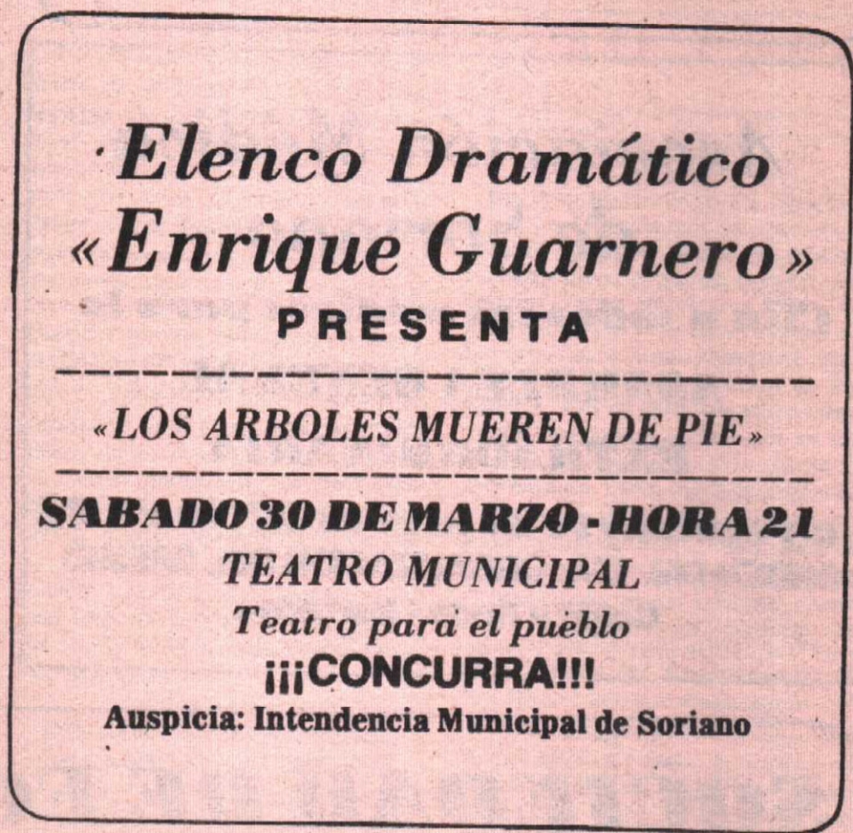 ELENCO GUARNERO- Reinicia su actividad, presentando la obra “Los árboles mueren de pie” de Alejandro Casona. Contando con la colaboración del Director de Cultura Prof. Alejandro Demarco, tiene previsto actuar en la temporada oficial de 1985 con la presentación e interpretación de diferentes obras, entre ellas “La importancia de llamarse Ernesto”.