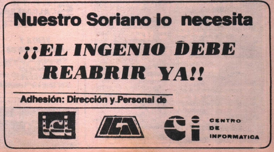 EL INGENIO – Se hacía evidente la necesidad de impulsar la reapertura del Ingenio Azucarero por lo que significaba para el medio y para el País. Por tal motivo se realizaban gestiones a todo nivel, reuniones de diferentes instituciones gremiales, organizaciones, fuerzas vivas y también se traslucía en avisos de diferentes comercios que incluían en los mismos esa demanda de la necesidad de la reapertura de esa fábrica.