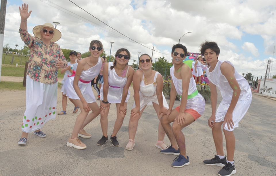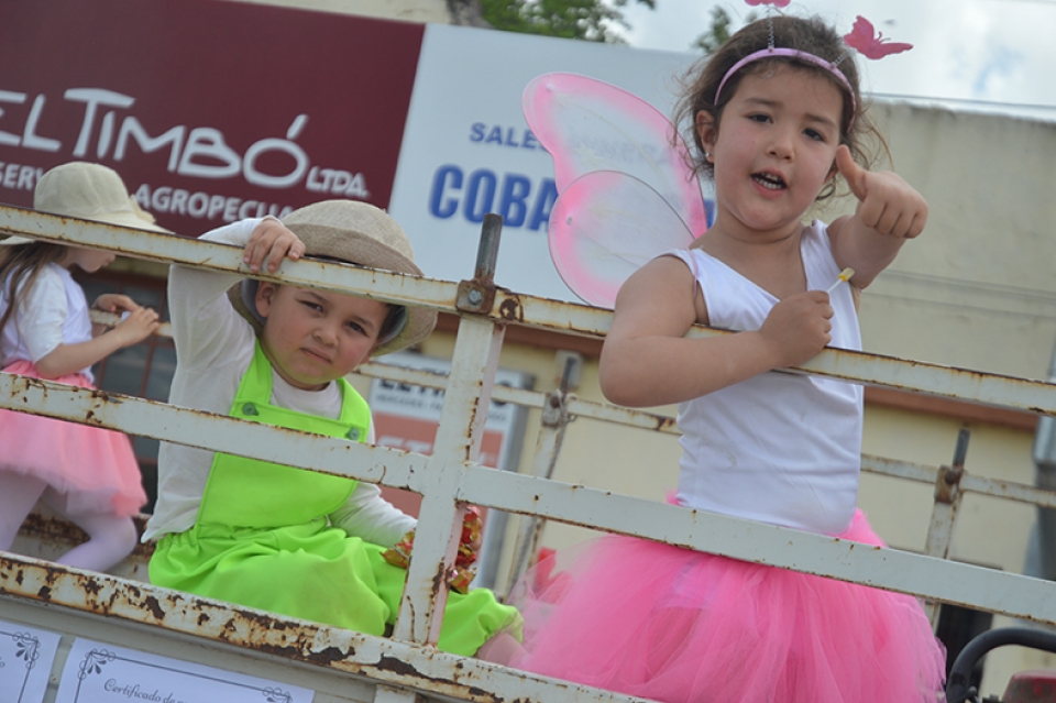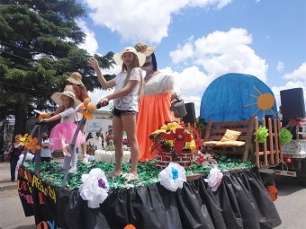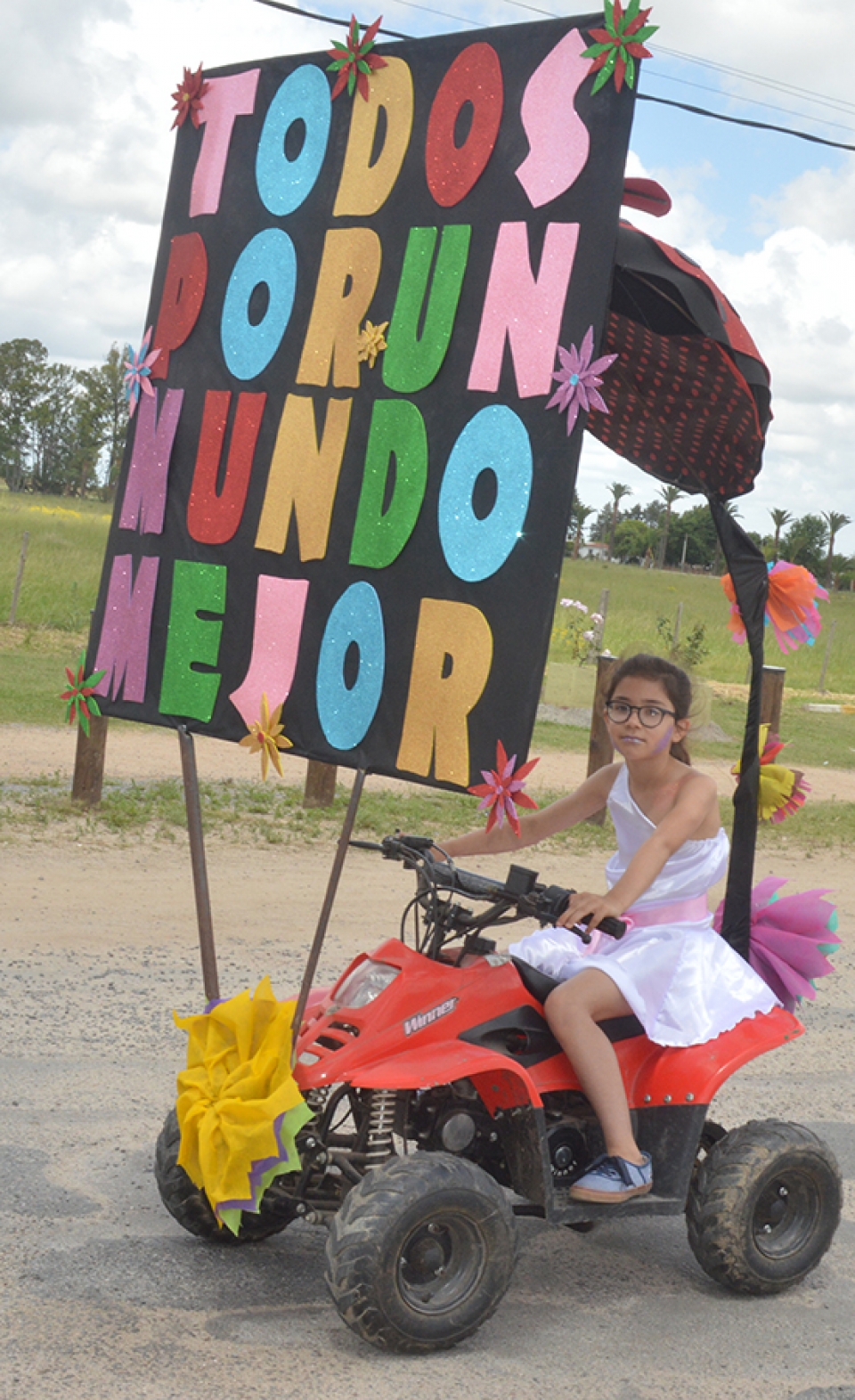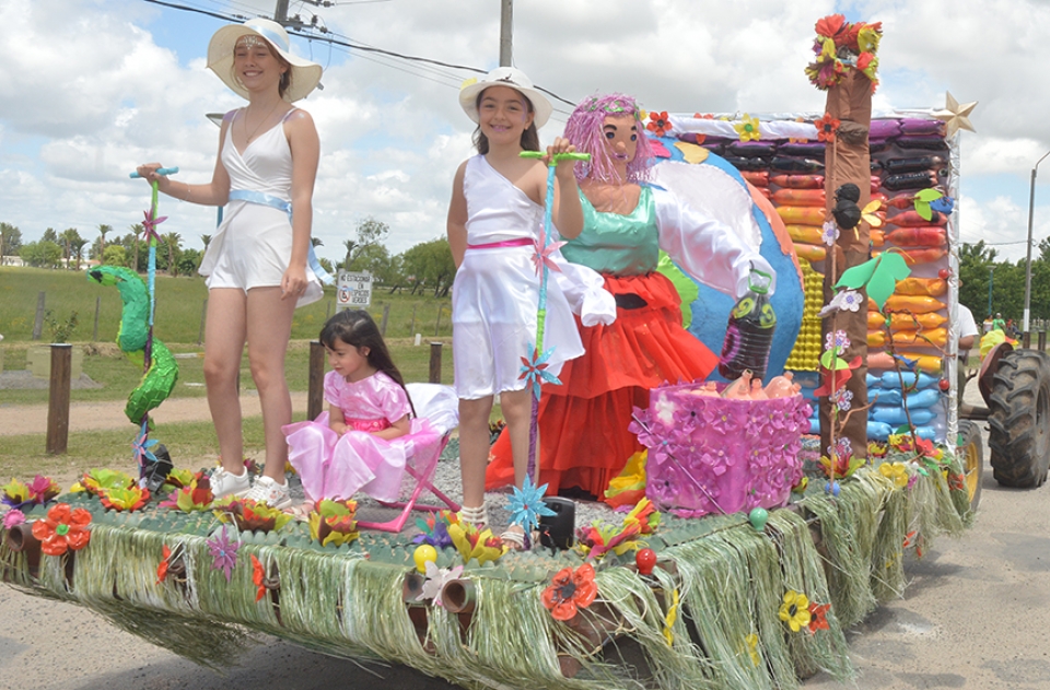Carrozas Participantes Como todos los años, Palmitas se destaca por su alegría, fiesta familiar, también por ese deseo de mantener la misma. Una de las carrozas de grupos de jóvenes unidos presentó su propuesta “Todos por un mundo mejor” apreciándose un trabajo realizado con diferentes elementos reciclados. Otra de las propuestas estuvo a cargo del grupo “Unidos por el pueblo” que ofreció su trabajo denominado “Con doña Mary y su jardín nos venimos a divertir”. Allí la idea se centraba en una señora que iba regando su jardín y también se podía apreciar la utilización de diferentes elementos reciclados. La tercera carroza correspondió a un grupo de amigos del club organizador que presentó su idea titulada “La barra de Liber junto a la pantera y las palmeras del Club Libertad”.