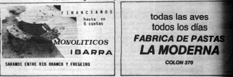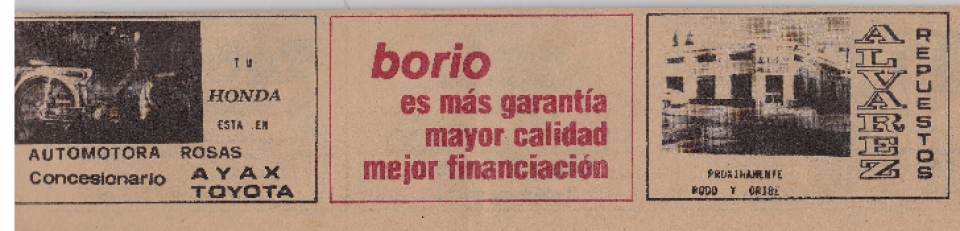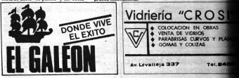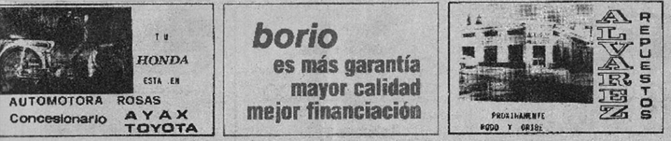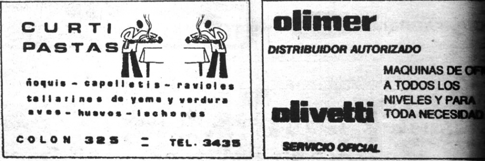 Publicidad al pie de páginas de los comercios desaparecidos: El Galeón, Vidriería Crosi, Credisol Club, Borio mientras que también figuran allí avisos de Automotora Rosas y Alvarez Repuestos estos últimos aún vigentes, enfrentados en sus respectivas esquinas.