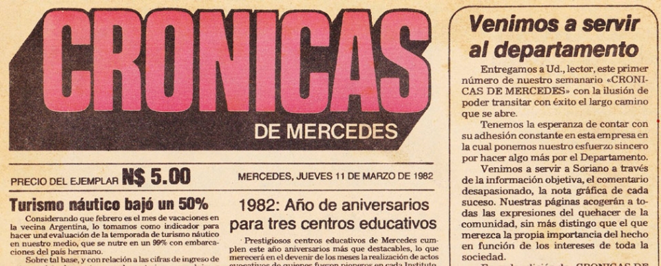 Decimos este actual diario, pues comenzó a editarse como un semanario, apareciendo por vez primera el jueves 11 de marzo de 1982, con el título de “Crónicas de Mercedes”, conmemorándose entonces los 38 años de ser recibido y leído por los vecinos, no sólo de esta ciudad, sino de todo el departamento de Soriano y por gran parte de los habitantes de Río Negro.