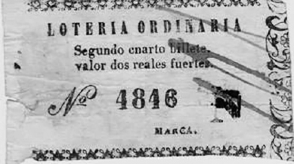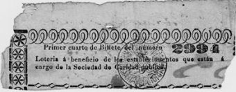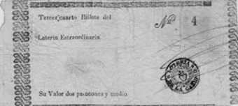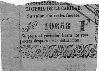 Muestra de un billete para “Lotería Extraordinaria” anterior a 1850 con el sello que llevaba como garantía: “un corazón coronado y leyenda de “Lotería de la Caridad”. Valor: 2 patacones y medio.