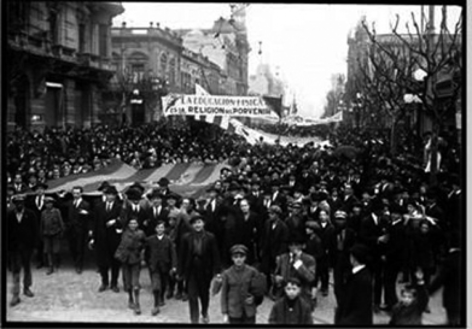 Enloquecidos por el triunfo, el público uruguayo recorre la avenida principal de Montevideo, celebrando la conquista del Mundial, pobladas calles y veredas a su paso.