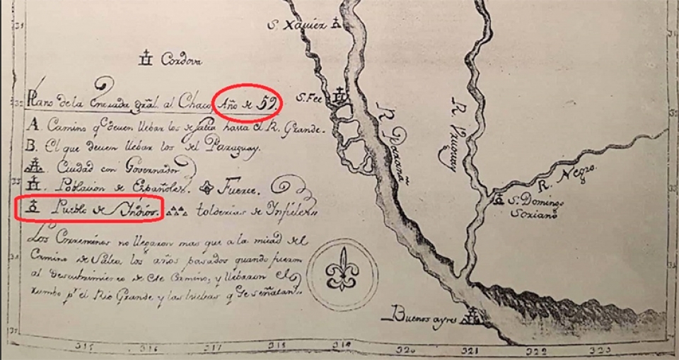 Se entiende la alternancia e intermitencia de órdenes religiosas o corregidores, como solía suceder con otras reducciones o pueblos de indios como en la misma San Xavier (mapa). Pero además tomemos en cuenta los múltiples mapas en donde Villa Soriano aparece con otros nombres, como Assomption, Conception, Visitation e incluso Santo Domingo o San Salvador (esto último viene de la tradición oral que confirmaba la presencia de una comunidad chaná establecida sobre ese río que se trasladó a isla Yaguarí y de allí a Vizcaíno y que Dámaso A. Larrañaga y Andrés Oyarvide dan cuenta).