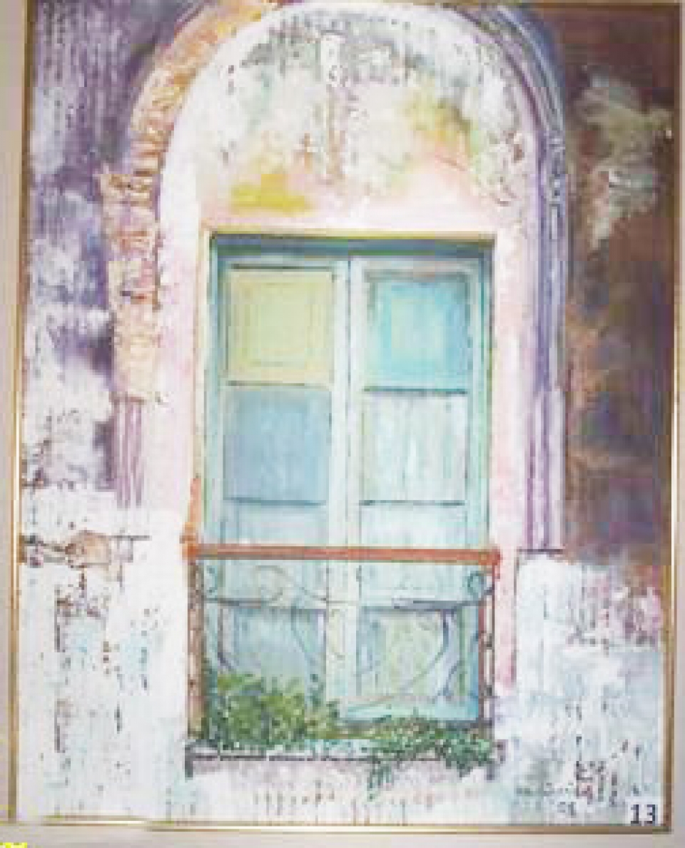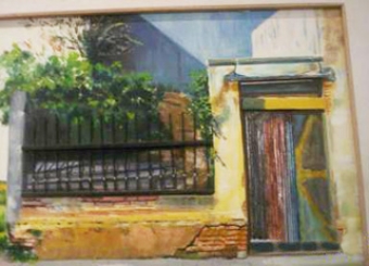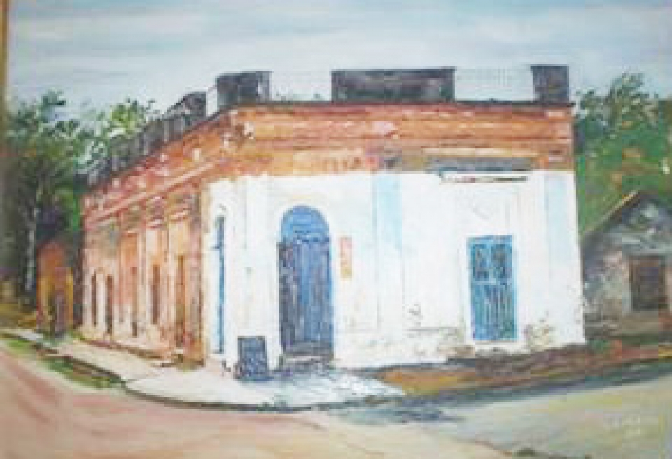 Contemplamos ahora los cuadros relativos a esquinas o edificios en “la zona del Centro” comenzando por la pintura indizada con el Nº. 13, que es un detalle del frente de la casa ubicada en calle Colón Nº. 66. Se trata de un óleo de 34 por 45 cms.