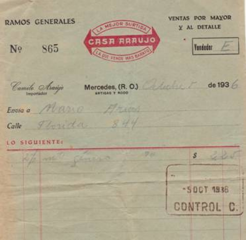 Y luego cruzando la calle Artigas, mismo sobre la de Rodó, hallamos la “Casa Araújo” que en sus facturas y notas destacaba que era la mejor surtida y la que vende más barato, comerciando en Ramos Generales con preferencia en el de Tienda.