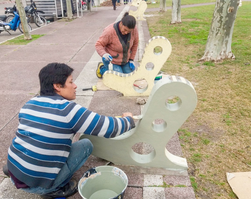 En Plaza Constitución trabaja personal de áreas verdes y espacios públicos en poda y jardinería, y además funcionarios de construcciones trabajan en veredas, albañilería, pintura y mantenimiento general, y electricistas preparando lo que va a ser “mejoramiento de luminarias y lámparas, incluida la glorieta”.