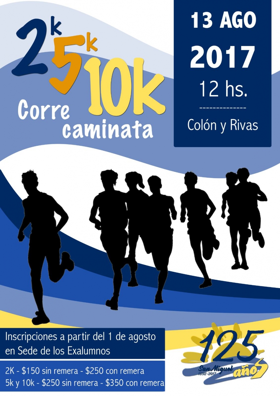 Se recuerdan los 202 años del nacimiento de San Juan Bosco que se celebrará el 16 del corriente y los 125 años del colegio mercedario. El director, Padre Miguel Suárez, señaló que para celebrar los 202 años habrá actividades especiales tanto a nivel de Primaria como de Secundaria. Manifestó además que recordando los 125 años del colegio, el domingo 13 del corriente al mediodía se estará realizando una correcaminata de 2, 5 y 10 kilómetros que partirá desde Colón y Rivas. Las inscripciones ya se están recepcionando en la sede de los ex alumnos y quienes participen de los 5 y 10 kilómetros con la inscripción que tiene un costo de $ 250 y $ 350, recibirán una remera. |