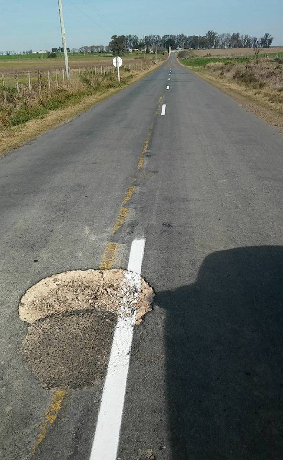 Un pozo de considerables dimensiones se cruzó en el camino del pintor de la banda blanca que marca el centro de la ruta. El funcionario de Vialidad cumplió con su función: pintar. En consecuencia el pozo quedó pintado en su interior, tal como quedó plasmado en la atípica imágen. |