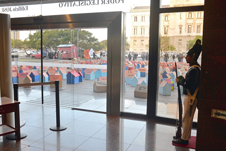Los militantes de FUCVAM colocaron sobre dicha explanada más de 500 casitas de cartón construidas por los cooperativistas y sus familias.