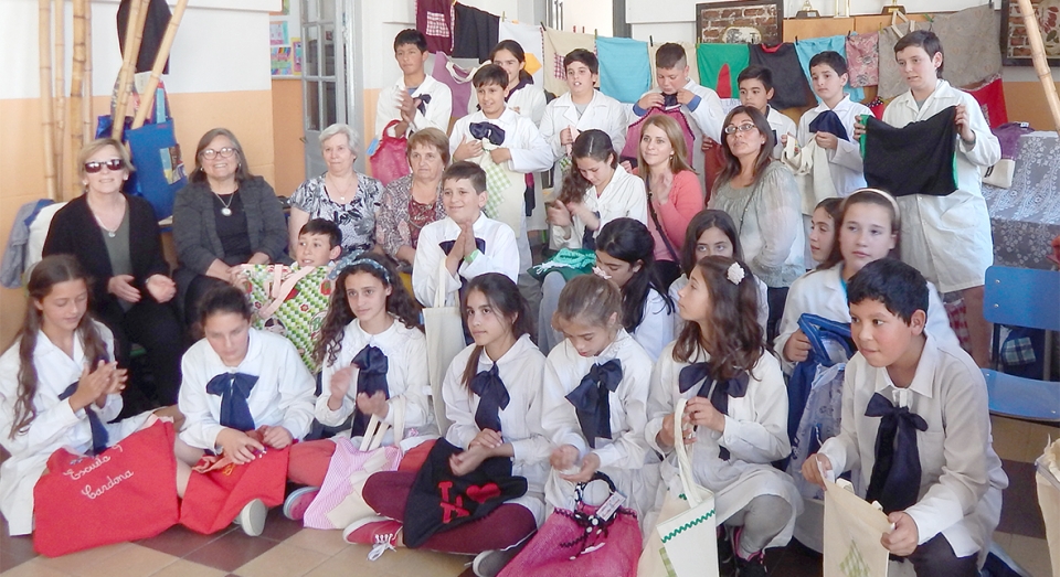 En una campaña que realizaron los alumnos de 6to. año B con la Maestra Ana Clara Hernández se visitaron comercios, obteniendo donaciones de telas que se sumaron a bolsas, retazos varios, piolas, cables, resortes, etc. que luego sirvieron para que madres y abuelas confeccionaran bolsos para hacer los mandados y suprimir a la bolsa de nylon.