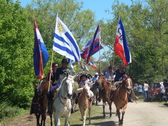 El desfile de más de cien gauchos, chinas y niños partió desde el Parque Cazeaux en Cardona, deteniéndose frente a la Capilla de la Virgen de los Treinta y Tres, arribando al parque temático a las 11 hs. aproximadamente donde fueron recibidos por los payadores Miguel Angel Olivera y Gabriel Luceno y el Tape Chaná para posteriormente entonarse las estrofas del Himno Nacional. El Grupo Cultural Pueblos Libres representó la obra CUARTEL GENERAL DEL MONZON, finalizando con la simbólica quema de un rancho. Durante la jornada en el escenario actuaron artistas de excelente nivel dándose cumplimiento a la extensa programación que incluyó a Eusebio Pastorino, Grupo de Danzas de Santa Catalina, recitador Héctor Curbelo Peña, Grupo de Danzas “El Pial”, Javier Mazzilli y Grupo de Danzas “Los Orejanos” de Mercedes, Pitingo Izaguirre de San Justo (E. Ríos- Rep. Argentina), grupo de baile de la Intendencia de Salto, finalizando con Dúo Copla Alta de Rocha. Se vivió una evocación con hondo contenido patriótico con la participación de numeroso público que colmó el agreste lugar donde se desarrolla el evento, a la sombra de espinillos y a la vera del Monzón. |