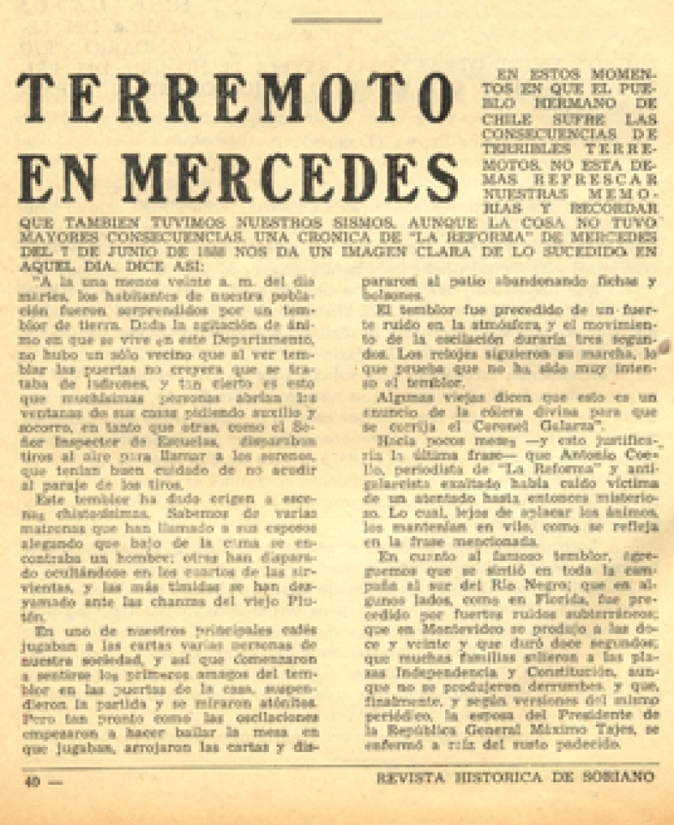 La prestigiosa Revista Histórica de Soriano, en su edición inaugural, en julio de 1960, hace referencia con el título "Terremoto en Mercedes", a un hecho ocurrido el 7 de junio de 1888. La crónica se basa en artículos del periódico "La Reforma" que sostiene que el fenómeno se registró "a la una menos veinte A.M. del día martes, cuando los habitantes de nuestra población fueron sorprendidos por un temblor de tierra. El mismo -agrega- fue precedido de un fuerte ruido en la atmósfera y el movimiento de la oscilación duró tres segundos. El temblor se sintió en toda la campaña al sur del río Negro y en algunos casos, como en Florida fue precedido por fuertes ruidos subterráneos. En Montevideo se produjo a las doce y veinte y duró doce segundos. Muchas familias salieron a las plazas Independencia y Constitución y hasta la esposa del Presidente de la República, Gral Máximo Tajes, se enfermó a raíz del susto padecido".