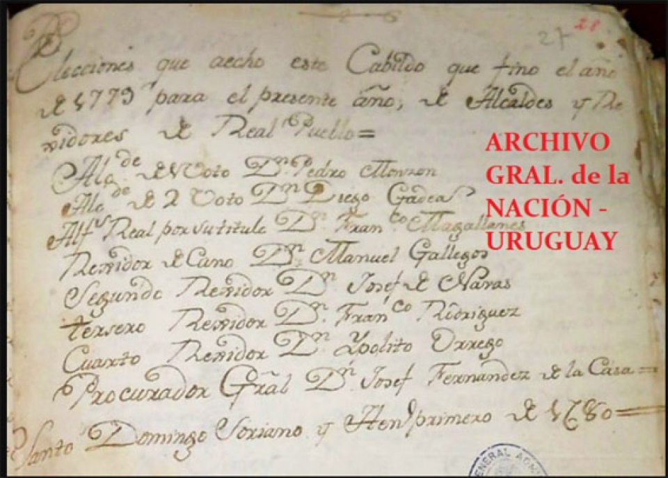 La imagen es documento en el Archivo General de la Nación de Uruguay, año de 1780 a uno de enero. “Elecciones que ha hecho este Cabildo”: Alcalde de 1er. Voto Pedro Monzón, de 2do voto Diego Gadea, Alférez Real Francisco Magallanes, Regidores Manuel Gallegos, José de Navas, Francisco Rodríguez, Hipólito Dorrego, procurador José Fernández de la Casa.