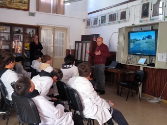 Las maestras Patricia Perazza y Silvana Nebot vienen trabajando junto a sus alumnos de 6º año de la Escuela Nº 4 de Mercedes en todo lo relacionado con Luis Tuya, el cual serà presentado en el marco de la Feria de Ciencia y Tecnologia. Hoy en la mañana participaron de una charla interactiva estando presentes en la oportunidad Federico Marota y Luis Troche quienes mostraron videos y acercron mucha informacion a los escolares. |