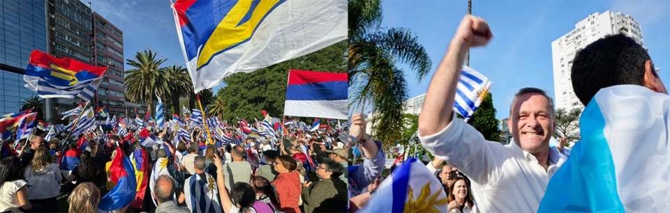 La fórmula Yamandú Orsi - Carolina Cosse participó de un "banderazo" en la rambla de Montevideo a la altura de la calle Jackson, donde los manifestantes llevaron fundamentalmente banderas de Uruguay en un intento por expresar la intención de captar la adhesión de aquellos que no se sienten íntimamente identificados con la postura del partido.