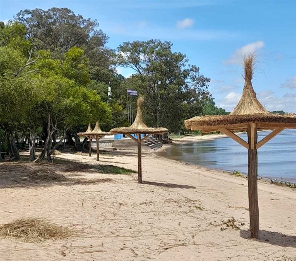 En playa de la Agraciada se han instalado quinchos en la faja de arena, para brindar espacios con sombra a los veraneantes.