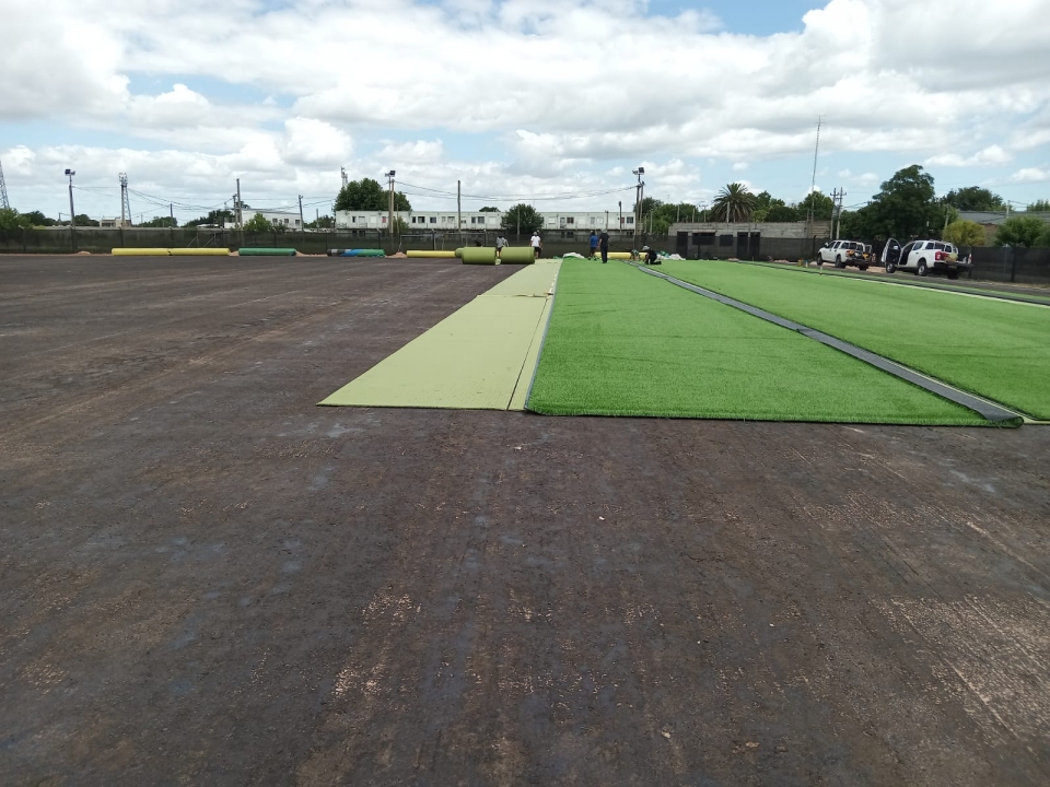 Ayer se comenzó con la instalación del césped sintético para el futuro estadio.