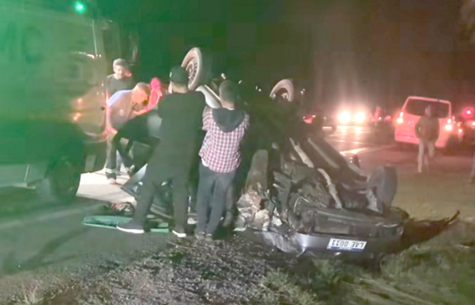 El accidente se registró anoche en la Ruta 1 frente al Hotel Days In. Un vehículo volcó y el conductor sufrió numerosas lesiones. En la imagen se observa el momento en que es asistido, aunque anoche no se conocían ni la identidad del lesionado, ni las causas del siniestro. |