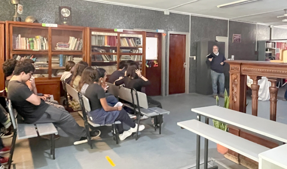En el marco del mes del libro continúa el ciclo de charlas que desde el área de Literatura junto a biblioteca y equipo de dirección, se vienen presentando en el liceo Nº 1 de Mercedes con escritores locales e invitados especiales. En las últimas horas estuvo el escritor Elbio Chítaro acompañado por las docentes Natalia Cisneros y Sofía Recalde, generándose un grato intercambio intelectual con alumnos del bachillerato de esa casa de estudios. |