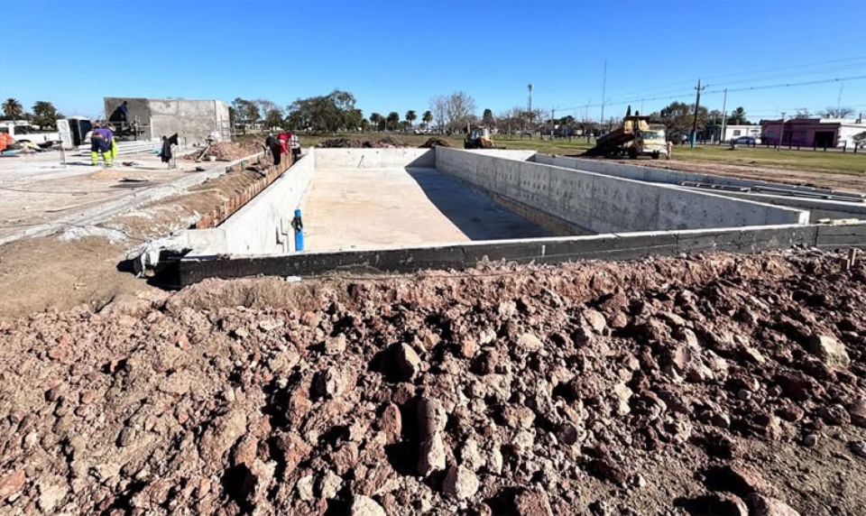 Un importante grado de avance muestran los trabajos de construcción de la piscina pública en Palmitas, donde ya se conformó con hormigón la estructura de la pileta.