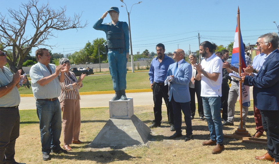 En un concurrido acto que se desarrolló en la mañana de ayer, quedó inaugurado el monumento que recuerda la figura del policía en actividad, como referente de la sociedad y su disposición a acudir en ayuda de quienes lo necesitan cada vez que es convocado. La iniciativa del Cabo Uberfil Viera que fue recogida por el sindicato SUPU, fue llevada a la práctica por el escultor Pedro Lapido y destacada por el representante de SUPU en Soriano Juan Naglieri, que habló en la oportunidad. |