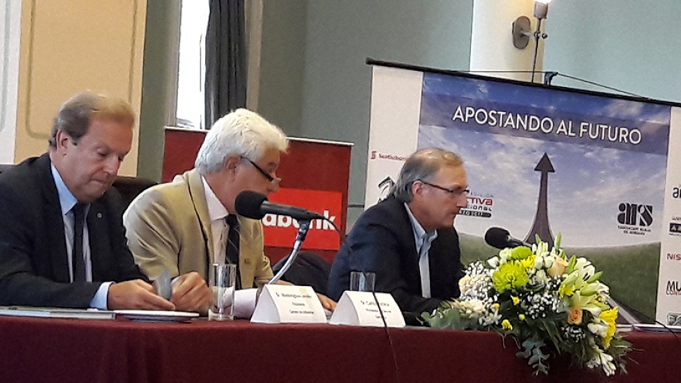 En la sala de presidentes del Mercosur se realizó este jueves el lanzamiento de la 22ª Expoactiva Nacional. En primera instancia hubo una disertación de Carlos Perera, presidente Cámara de Comercio, del Presidente de la Cámara de Industrias Washington Corallo y del presidente de la Federación rural Jorge Riani. El Ministro de Ganadería Tabaré Aguerre junto al Intenente Bascou, al senador Besozzi y autoridades de la ARS, posteriormente informarán sobre la exposición que se abre el venidero miércoles en Mercedes. En la mesa están presentes el Ministro Aguerre, el Intendente Bascou, el vice presidente de la ARS Jorge Andrés Rodríguez y gerente de banca minorista de Scotiabank. Horacio Correge.