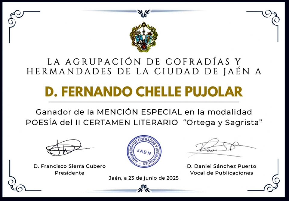 El escritor mercedario Fernando Chelle Pujolar quien desde hace varios años está radicado en Colombia desarrollando una proficua labor literaria, obtuvo una mención especial en la categoría de poesía del ll Certamen Literario “Ortega y Sagrista” que fue convocado por la Agrupación de Cofradías y Hermandades de la ciudad de Jaén en España. |