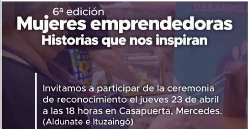 La Intendencia de Soriano, a través del Departamento de Promoción y Desarrollo, invita a la comunidad a participar de la 6ª edición de “Mujeres Emprendedoras - Historias que nos inspiran”. Es una instancia de reconocimiento a mujeres del departamento que mediante su esfuerzo, creatividad y compromiso, impulsan emprendimientos y contribuyen al desarrollo local. La ceremonia se llevará a cabo este jueves a las 18 hs., en Casapuerta (Wilson Ferreira Aldunate e Ituzaingó), en la ciudad de Mercedes. Esta actividad tiene como objetivo visibilizar y valorar el trabajo de mujeres emprendedoras, destacando sus trayectorias, experiencias y el impacto positivo que generan en la comunidad, promoviendo además espacios de encuentro e inspiración para otras personas interesadas en emprender. |
