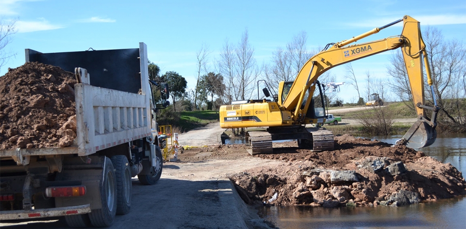 Se están ejecutando tareas de reparación mayor utilizando maquinaria pesada, para retirar la estructura deteriorada colocando nuevos caños de 80 cm. que conforman el sector de pasaje de las aguas y rellenando con material granular cementado.
