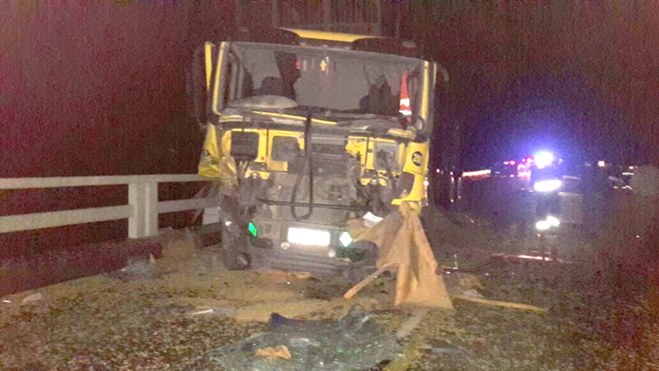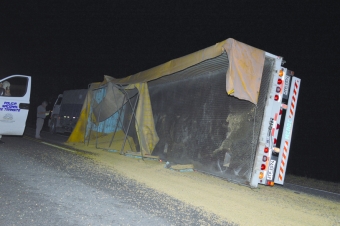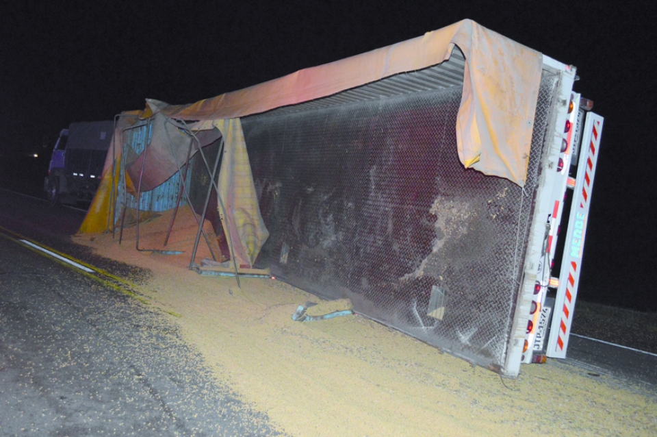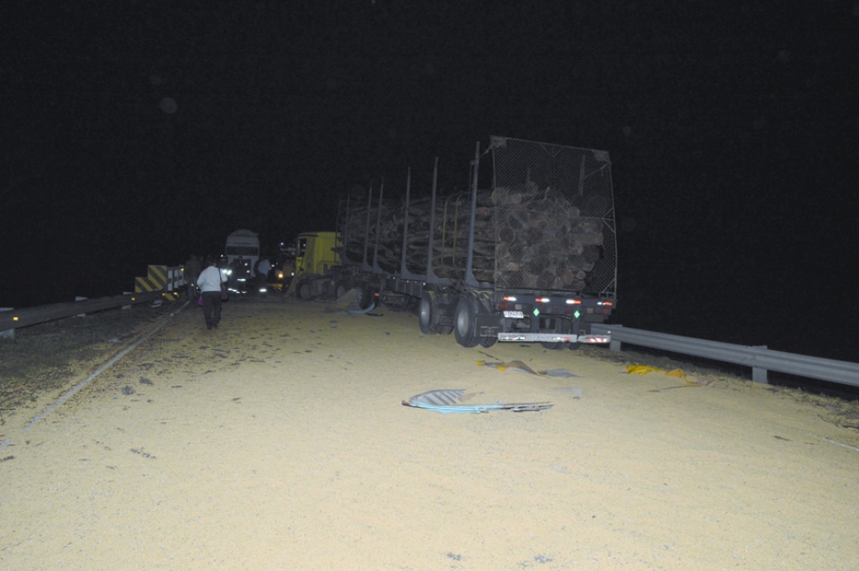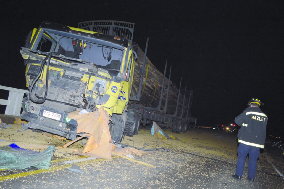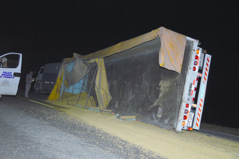 Un espectacular accidente se registró anoche en ruta Nº 2 a la altura del kilómetro 292, prácticamente sobre el puente del arroyo Pantanoso. Allí entraron en colisión dos pesados camiones, uno cargado con madera y el restante con soja. El camión Alistra matrícula RTP 2385 iba cargado de rolos con destino a Fray Bentos, mientras que hacia Mercedes circulaba el camión Volkswagen matrícula JTP 0168 que llevaba la zorra JTP 1574 cargada con unos 30 mil kilos de soja. Debido al choque prácticamente frontal, el camión con soja continuó su marcha sobre la ruta volcando la zorra en la que se transportaban unos 22 mil kilos de semilla, la que quedó esparcida sobre el pavimento, generándose en algunos puntos una capa de 15 centímetros.