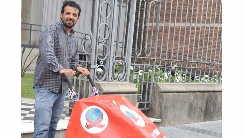 En su pequeño equipaje se observa el símbolo del VIH y el nombre de su proyecto que es “Camino de Aline, una vuelta al mundo a pie, por la vida y contra el sida”.