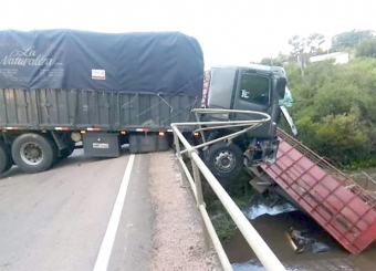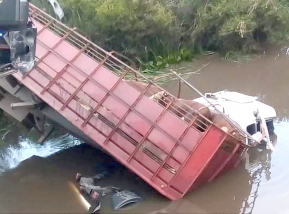 Sobre las últimas horas de la tarde de ayer se produjo un impresionante accidente en el puente ubicado en ruta Nº 7 a dos kilómetros de la ciudad de Tala, Canelones. El siniestro ocurrió en el kilómetro 76 e involucró a dos pesados camiones; uno de ellos cayó a las aguas del arroyo mientras el otro quedó colgando obstaculizando la ruta. El vehículo que cayó al arroyo transportaba ganado en pie. Las autoridades indicaron que no hubo heridos de gravedad. |