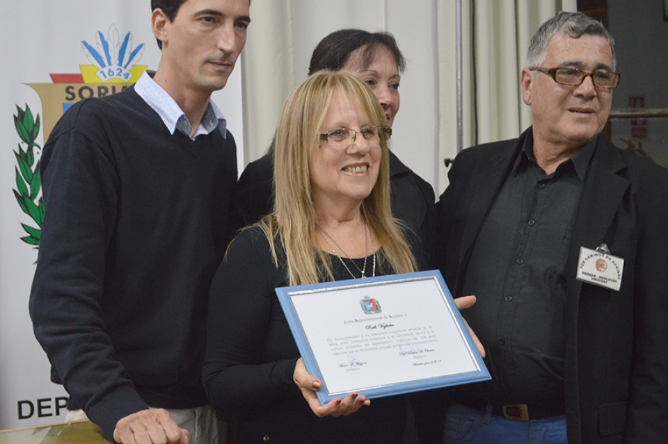 El legislativo departamental también tributó homenaje a la cantautora rochense pero mercedaria por adopción Ruth Vigliem que cantó por pirmera vez a los diez años de edad y subió al escenario del estadio Koster como integrante del Dúo Las Madreselvas cuando tenía 13. Este acto se dijo, tiene como propósito demostrar que valores existen y que muchas veces parecen escondidos. Los promotores de este reconocimiento fueron los conductores del programa “Por Caminos de Soriano” Aladín González y Fanny Bentancur. La solidaridad, la simpatía, dedicación, entrega, compañerismo y la ternura fueron conceptos que definieron a la artista por parte de quienes hicieron uso de la palabra. Se destacó su formación en la música, el canto, popular y que junto a su hermana Estela, hoy desaparecida, conformó el Dúo Las Madreselvas, participando destacadamente en numerosos eventos. Su trayectoria la ha recorrido también junto a su esposo Julio Reyes. Se recordaron sus primeras actuaciones en lo que fuera el Fogón Criollo del Centro Artigas de ex alumnos salesianos de Mercedes. Fue felicitada por todos los presentes, de pie y con un aplauso. |