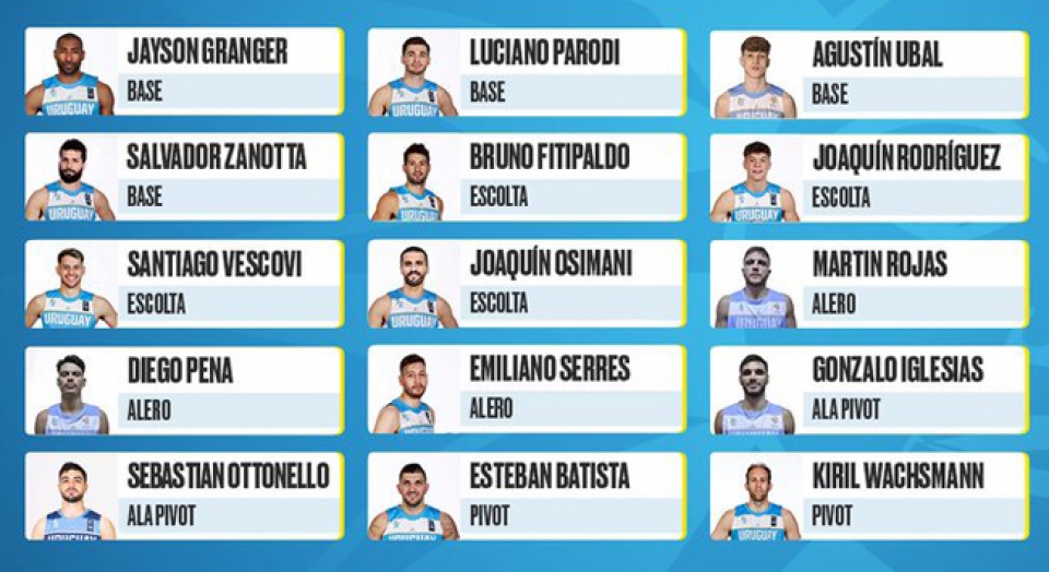 Con el mercedario Joaquín Rodríguez y el fraybentino Emiliano Serres, el DT de la selección uruguaya de básquetbol Rubén Magnano, nombró a los 15 jugadores que enfrentarán a Estados Unidos el jueves 25 hora 22 en Las Vegas y a Puerto Rico el lunes 29 en el Antel Arena hora 20.10, en el marco de las Clasificatorias rumbo al Mundial de 2023. De esos 15, tres quedarán afuera del viaje a Estados Unidos, siendo las principales novedades el base Salvador Zanotta y el alero Joaquín Osimani, de Peñarol y Goes respectivamente. Sin la presencia de Santiago ‘Pepo’ Vidal y con la ausencia de Mathias Calfani por lesión, no hay mayores sorpresas dentro de una lista en la que no repiten respecto a la última convocatoria el alero Juan Ignacio Ducasse, el ala-pívot Theo Metzger ni el pívot Mauricio Arregui. |