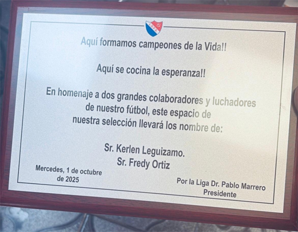 Anoche y aprovechando que los pibes de la selección sub 15 de Mercedes se encontraban cenando en el Estadio Köster, se procedió a colocar una placa reconociendo la labor de Kerlen Leguízamo y Fredy Ortiz, como colaboradores de las selecciones tricolores. Un gran gesto sin dudas para personas que siempre están para dar una mano. |