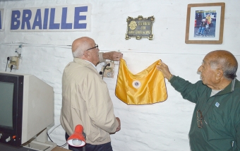 Mario López, esposo de Juanita, junto al presidente del club descubrieron la placa que quedó en la sala Braille.
